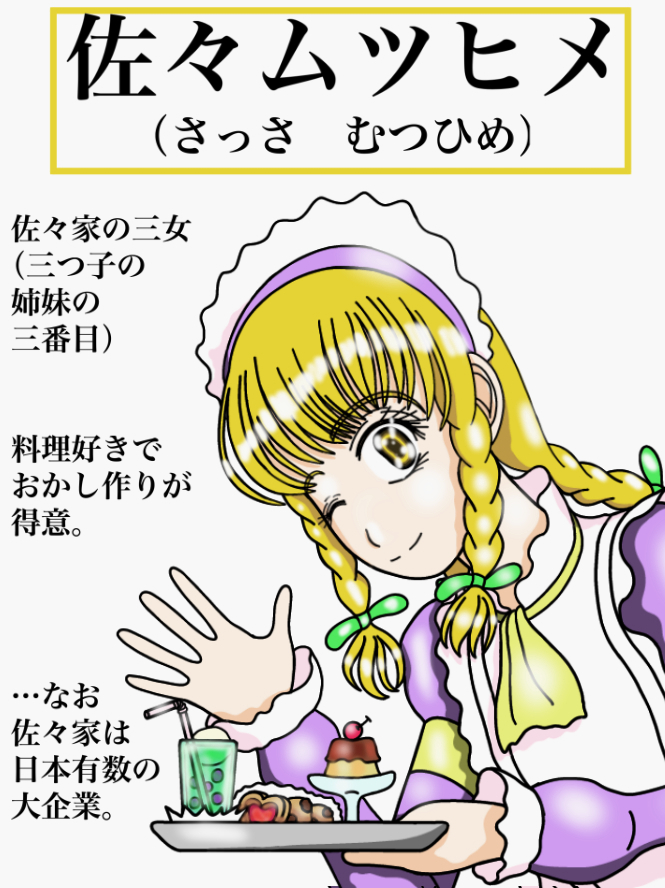 …ちなみに佐々ムツヒメには「佐々マナビ」と「佐々ミコ」という三つ子の姉妹がおり、佐々ムツヒメは三つ子姉妹の三番目、料理が上手いだけでなく、誰にでも優しく控えめで、いざという時はカルチャー教室で習った護身術が炸裂する。